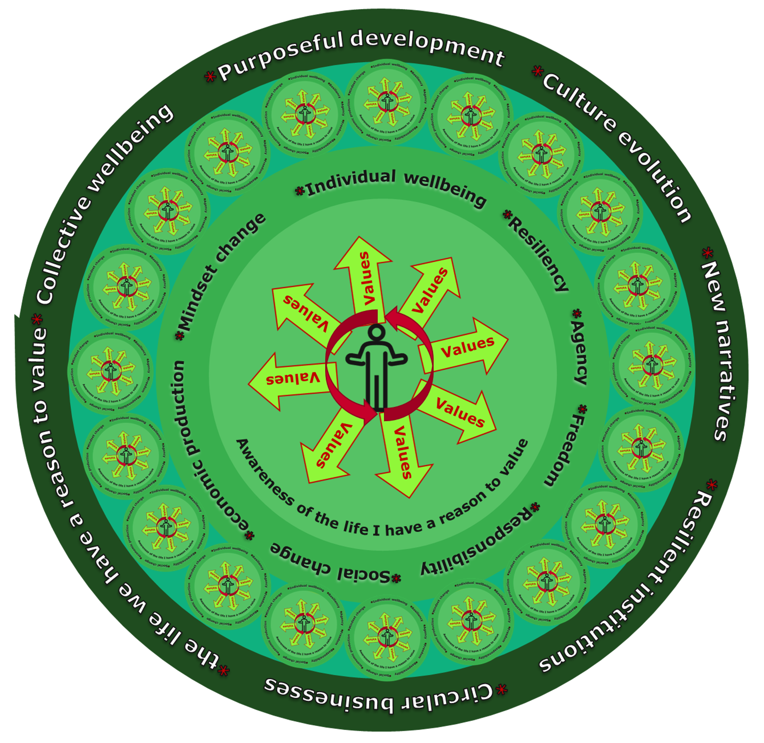 A mindset is a narrative we tell ourselves which defines what we perceive as reality. The set of collective realities become our cultures. Narratives, realities, and cultures are influenced by values. Values are identified with agency, freedom, and responsibility. Values-based decision-making expands individual, organizational and collective well-being[1] as it creates the lives that individuals have a reason to value.